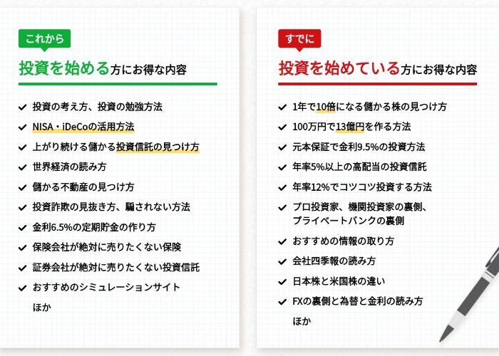 このように投資の初心者にわかりやすく株や不動産においての投資ノウハウを解説しています。