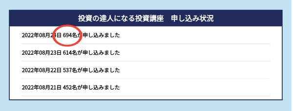 このような有益な内容が無料で学べるとあって「投資の達人になる投資講座」は1日500人前後ほどの申込みがあるようです。