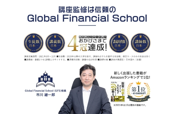 この講座はGlobal Financial School(GFS)が提供する無料の投資セミナーで、2021年の最も信頼できるオンライン投資セミナーに選ばれ投資セミナー満足度など数々の項目で1位を獲得しています。