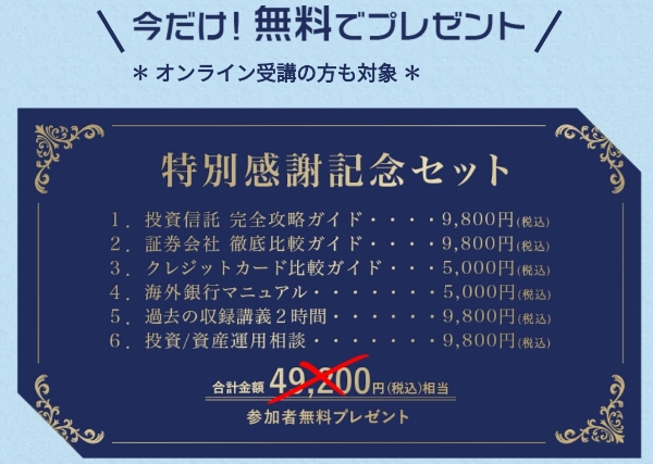 今なら49,200円相当の特別感謝記念セットもオンライン講座の利用者も対象でプレゼントされるので、気になった方は無料体験講座だけでも視聴してみてください。